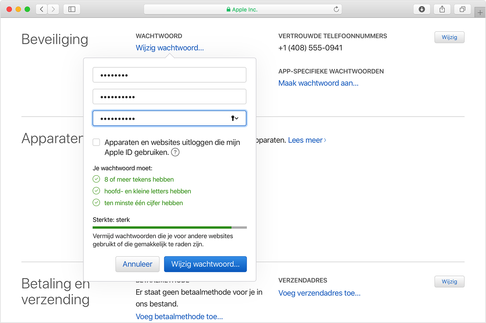 Als u niet zeker weet of u een sterk wachtwoord hebt, gaat u naar de Apple ID-accountpagina om uw wachtwoord zo snel mogelijk opnieuw in te stellen.