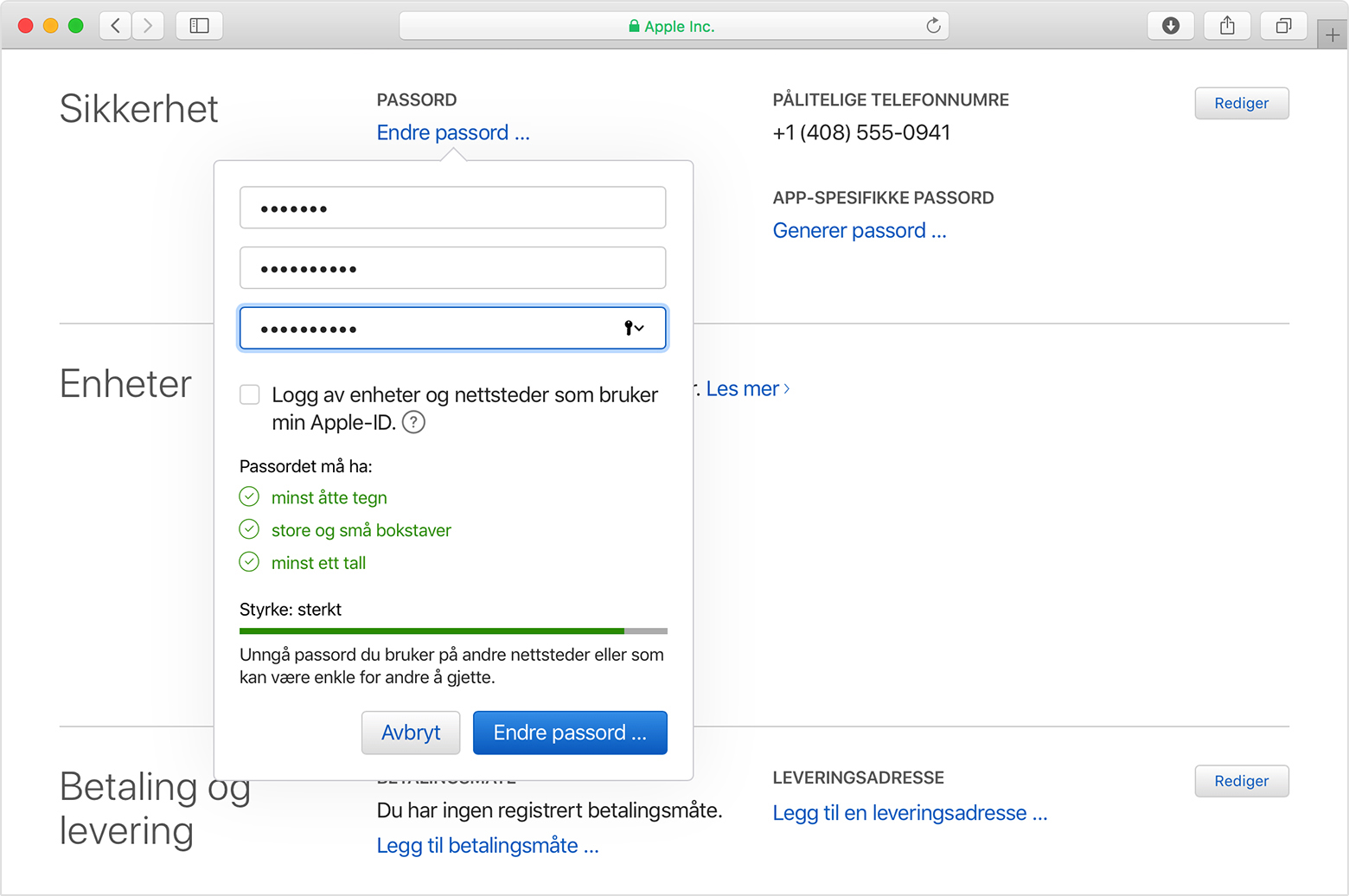 Apple-policy krever at du bruker sterke passord i forbindelse med Apple-ID. Passordet må ha åtte eller flere tegn og inneholde store bokstaver, små bokstaver og minst ett tall. Du kan også føye til ekstra tegn og skilletegn for å gjøre passordet enda sterkere. Apple bruker også andre passordregler for å sørge for at passordet ikke er enkelt å gjette.