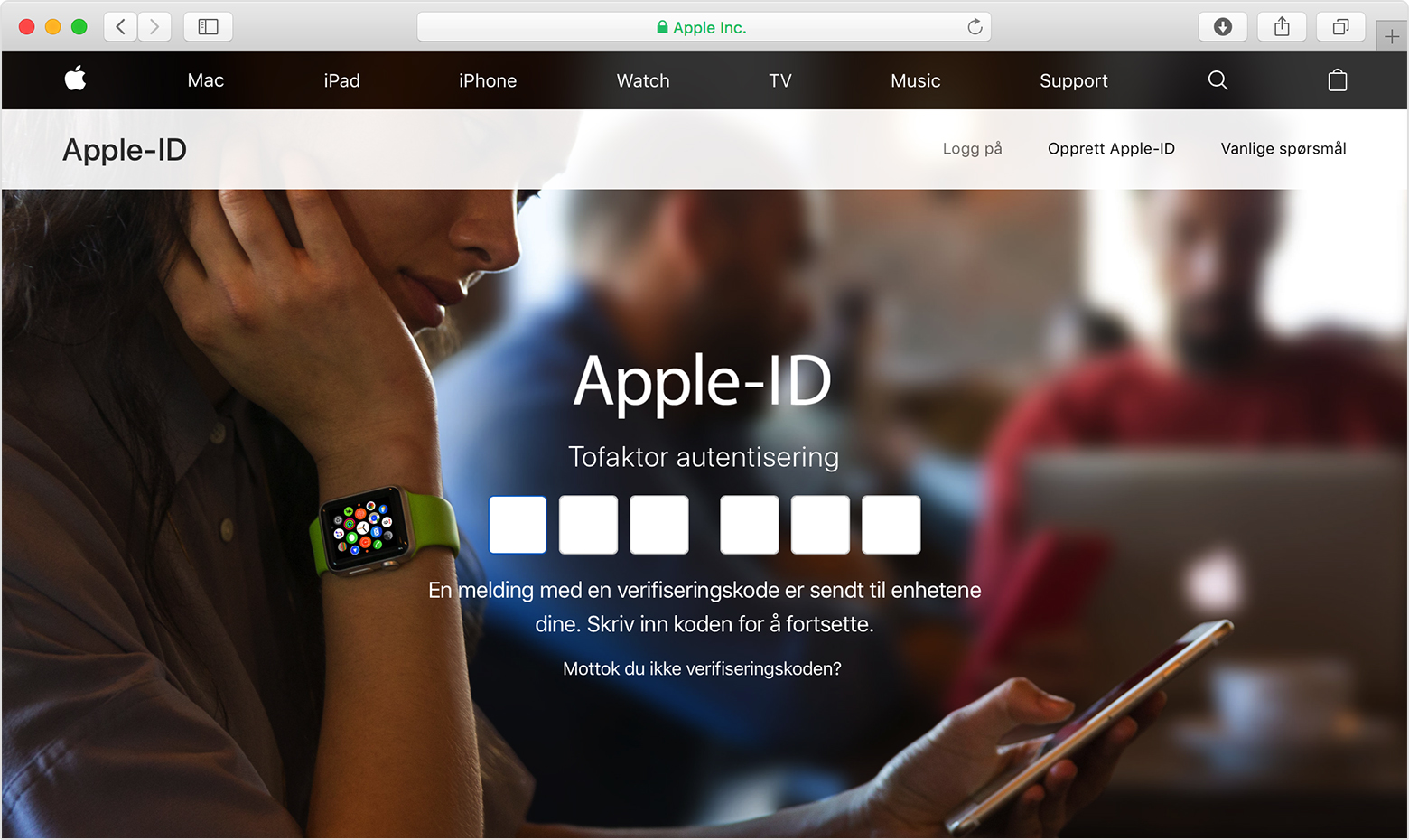 Apple tilbyr en forbedret sikkerhetsmetode som heter tofaktorautentisering. Den er laget for å sikre at du er den eneste personen som har tilgang til kontoen din, selv om noen andre kan passordet ditt. Når du skriver inn Apple-ID-en din og passordet for første gang på en ny enhet, ber vi deg om å verifisere identiteten din ved å skrive inn en sekssifret verifiseringskode. Denne koden vises automatisk på de andre enhetene dine, eller den sendes til et telefonnummer du har klarert. Bare skriv inn koden for å logge på og få tilgang til kontoen din på den nye enheten. Del aldri passord eller verifiseringskode med noen andre.