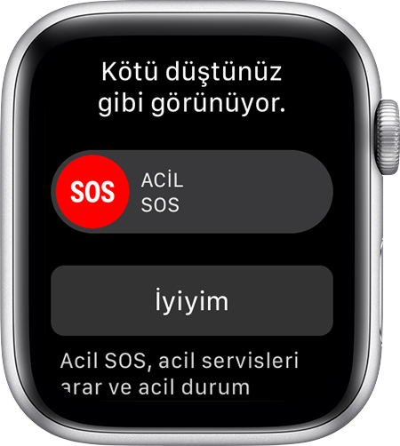 Apple Watch'unuz hareket ettiğinizi algılarsa uyarıyı yanıtlamanızı bekler ve acil servisi otomatik olarak aramaz. Saatiniz bir dakika boyunca hareketsiz kaldığınızı algılarsa aramayı otomatik olarak gerçekleştirir.