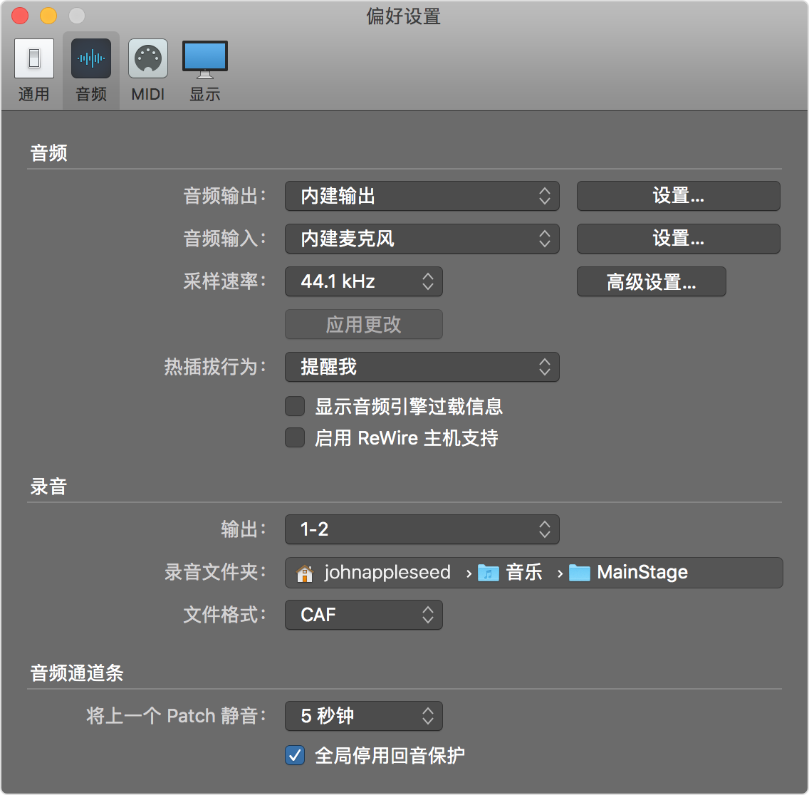 - 打开 MainStage,然后选取“MainStage”>“偏好设置”>“音频”。